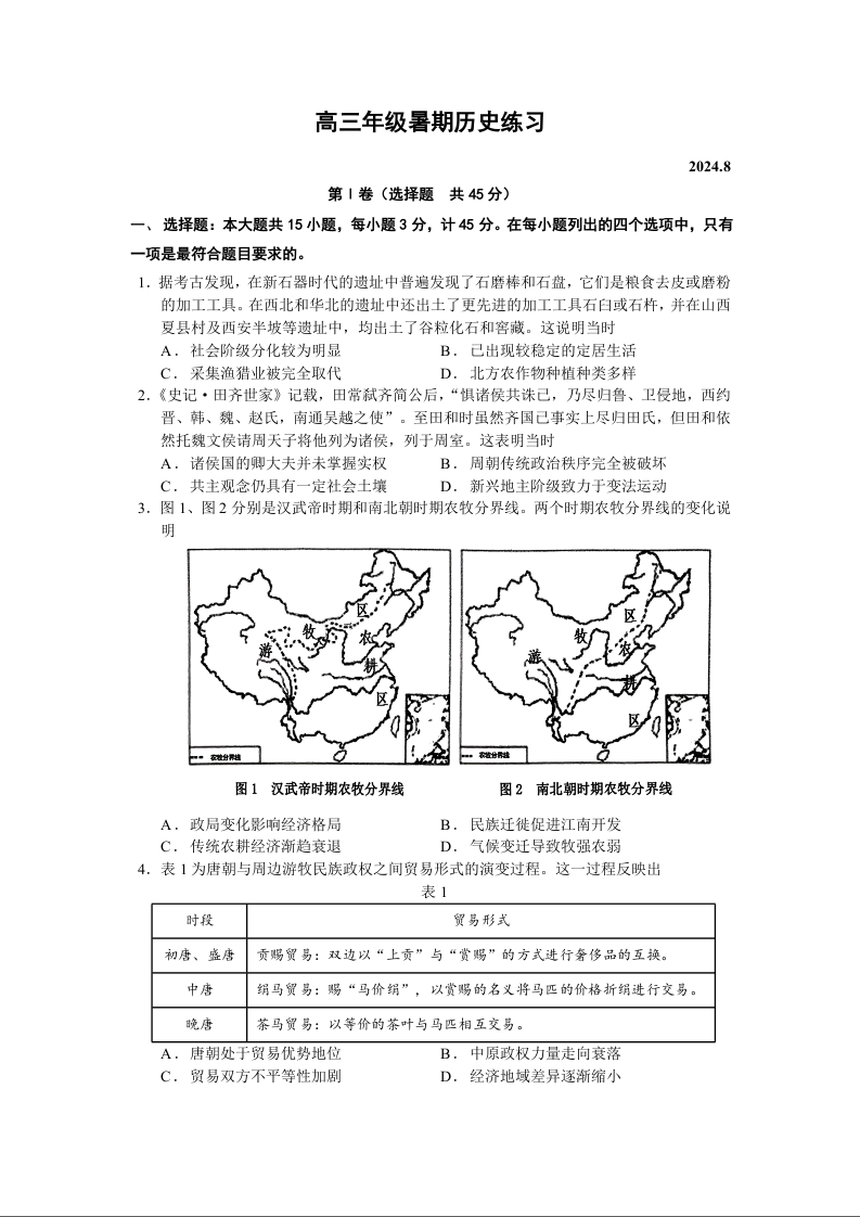 江苏省扬州中学2024-2025学年高三上学期8月开学考试 历史