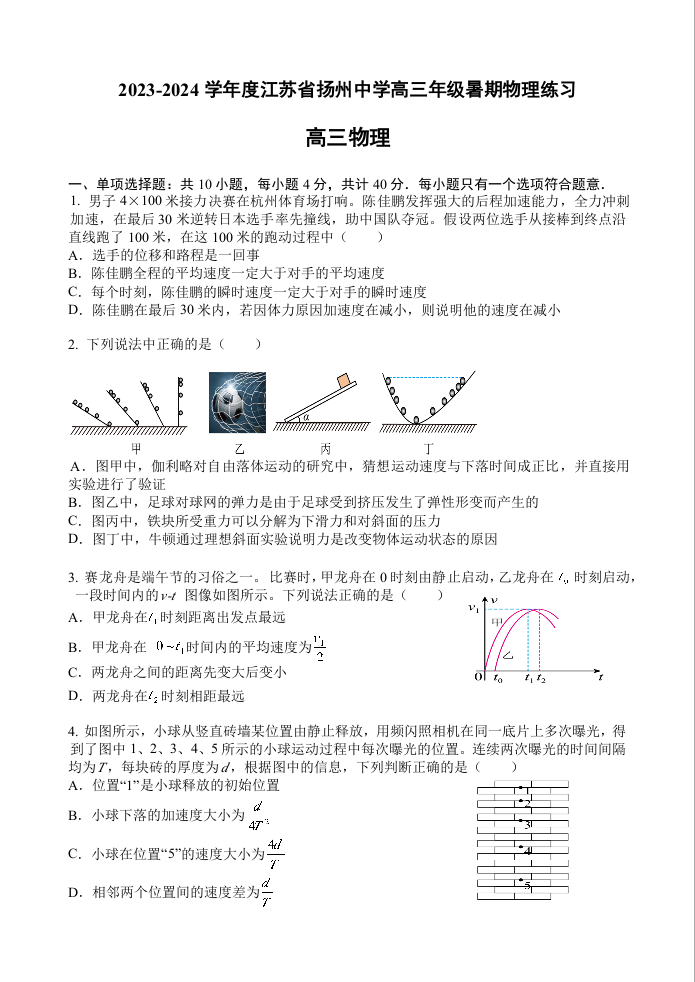 江苏省扬州中学2024-2025学年高三上学期8月开学考试 物理