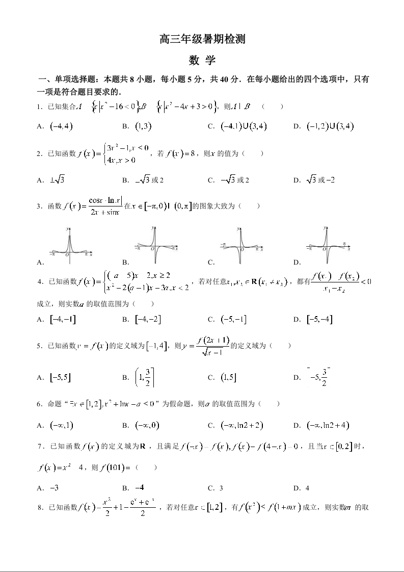 江苏省扬州中学2024-2025学年高三上学期8月开学考试 数学