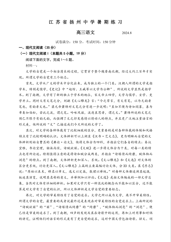 江苏省扬州中学2024-2025学年高三上学期8月开学考试 语文