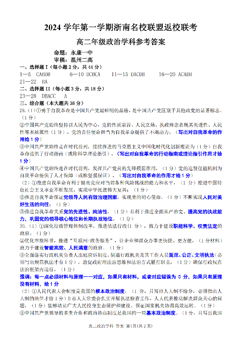 浙南名校联盟2024学年高二第一学期返校联考 政治答案