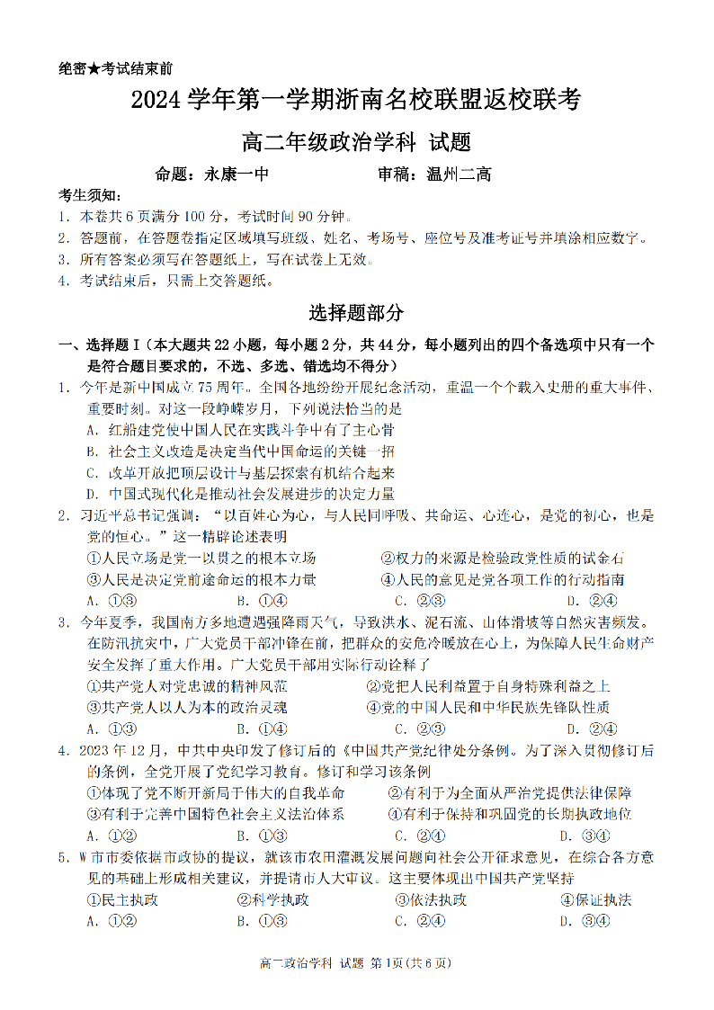 浙南名校联盟2024学年高二第一学期返校联考 政治