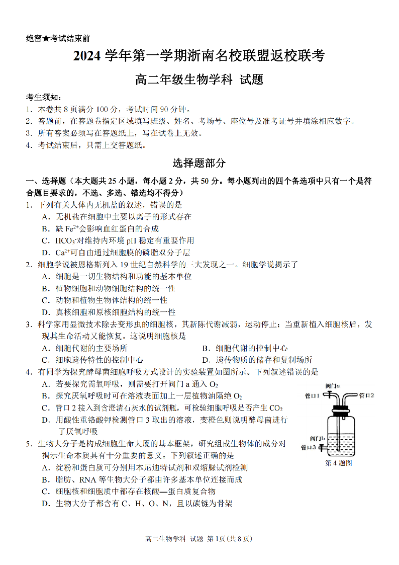 浙南名校联盟2024学年高二第一学期返校联考 生物
