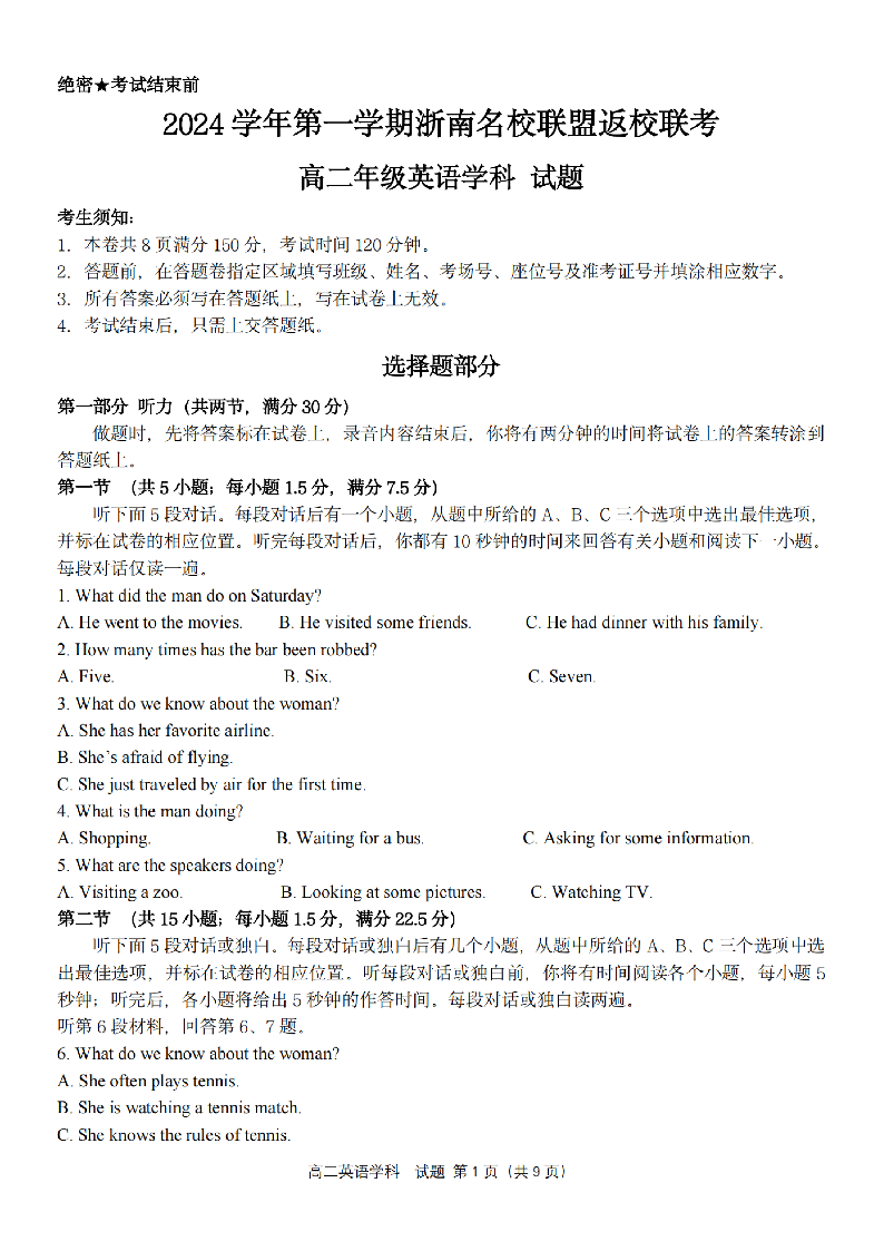 浙南名校联盟2024学年高二第一学期返校联考 英语