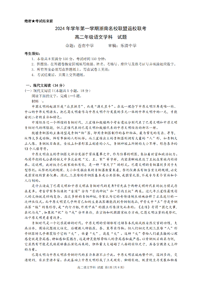 浙南名校联盟2024学年高二第一学期返校联考 语文