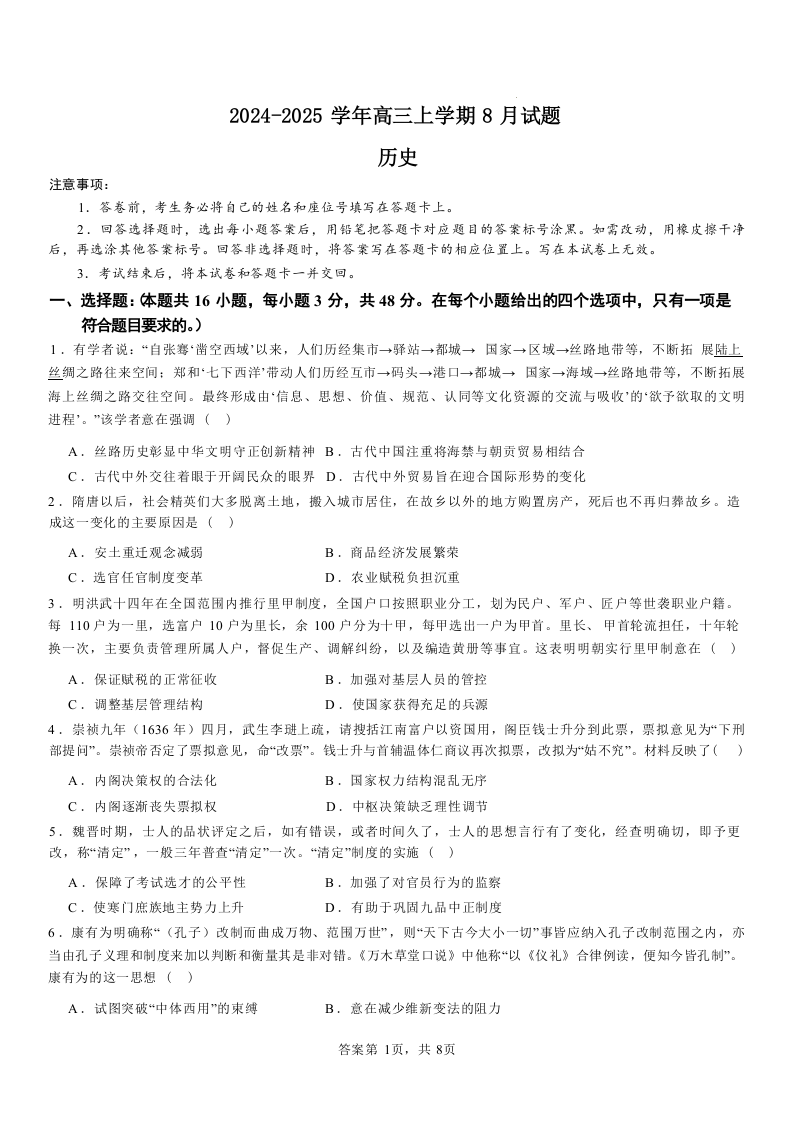 河南省安阳市林州市第一中学2024-2025学年高三上学期8月月考 历史