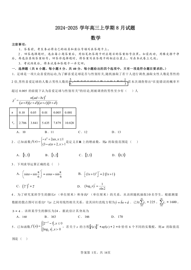河南省安阳市林州市第一中学2024-2025学年高三上学期8月月考 数学