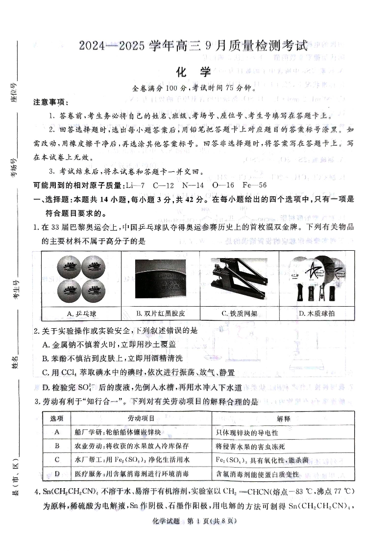 河南省青桐鸣2024-2025学年高三9月质量检测考试联考 化学