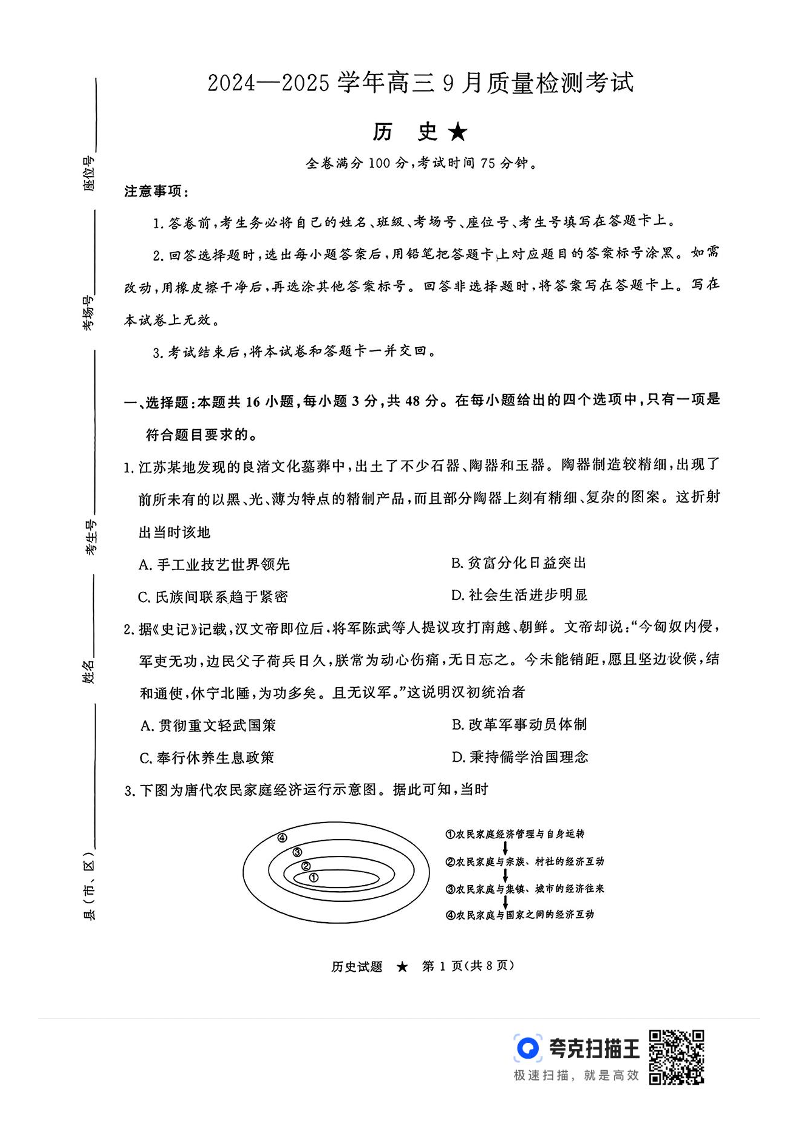 河南省青桐鸣2024-2025学年高三9月质量检测考试联考 历史
