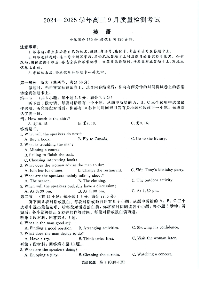 河南省青桐鸣2024-2025学年高三9月质量检测考试联考 英语