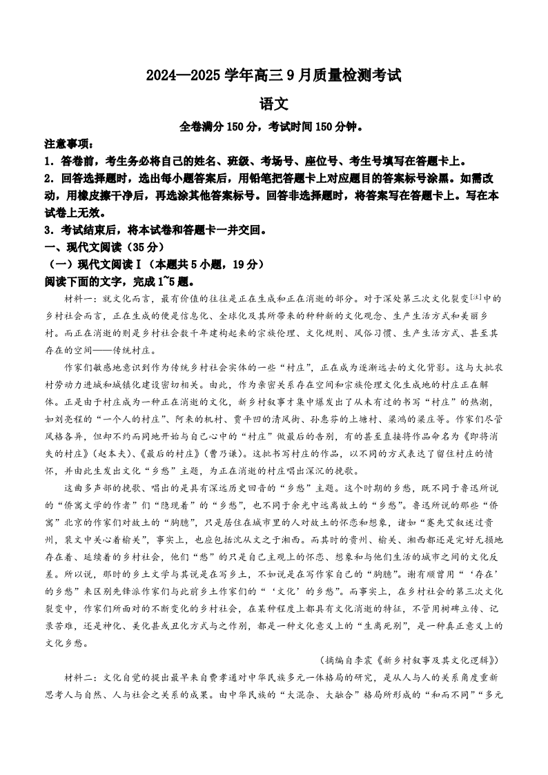 河南省青桐鸣2024-2025学年高三9月质量检测考试联考 语文