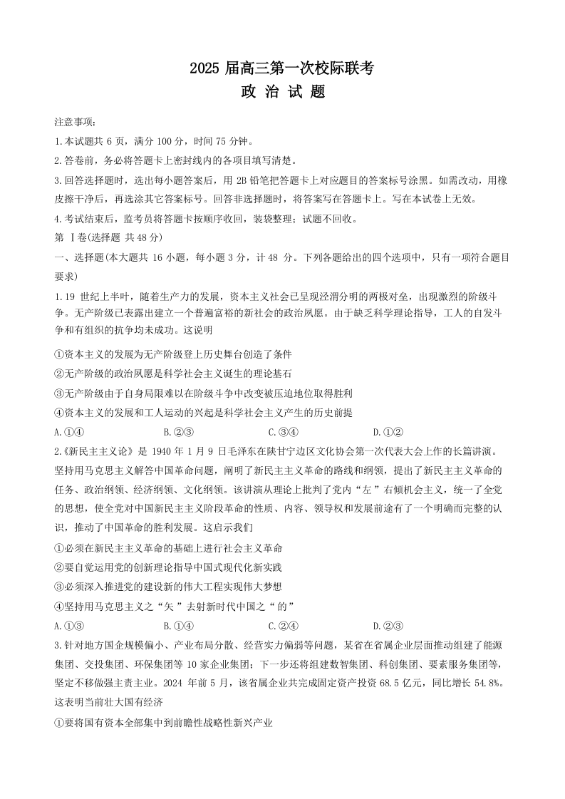 陕西省汉中市高2025届高三上学期第一次校际联考 政治