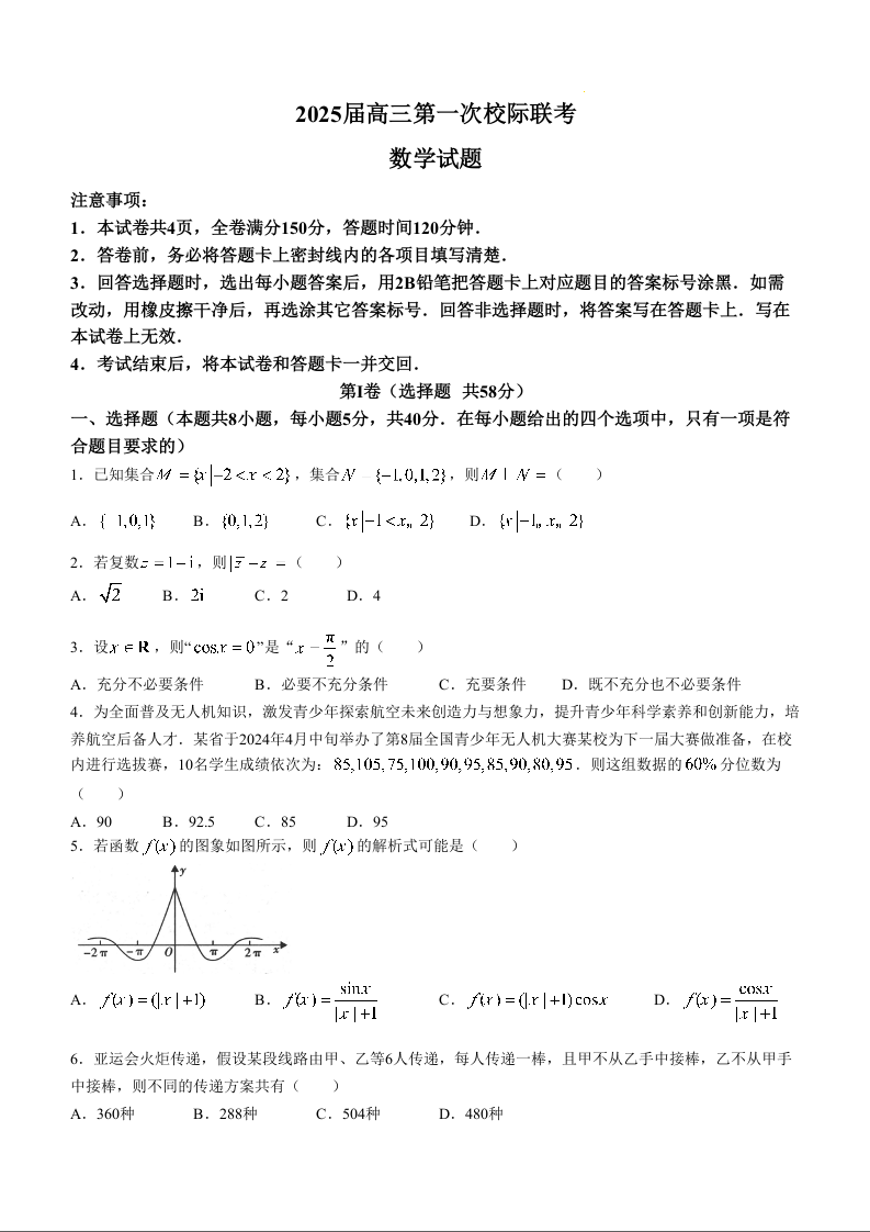 陕西省汉中市高2025届高三上学期第一次校际联考 数学