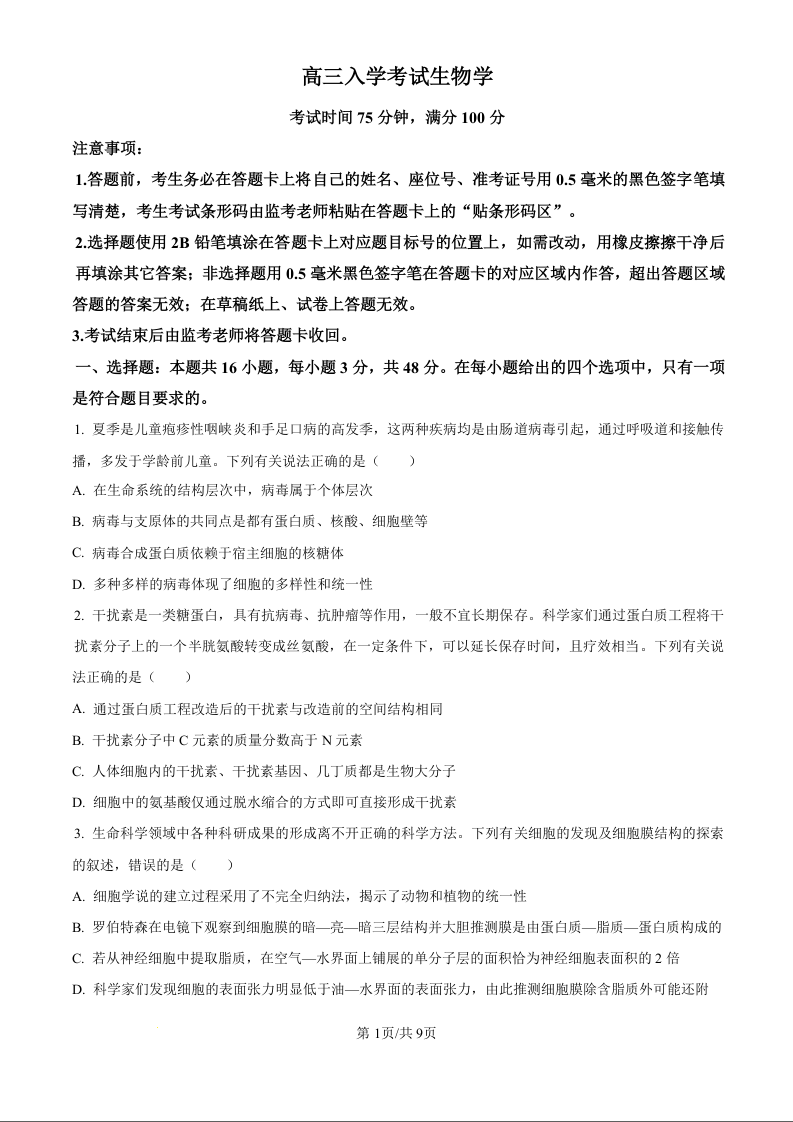 四川省成都市蓉城名校联考2024-2025学年高三上学期开学考试 生物