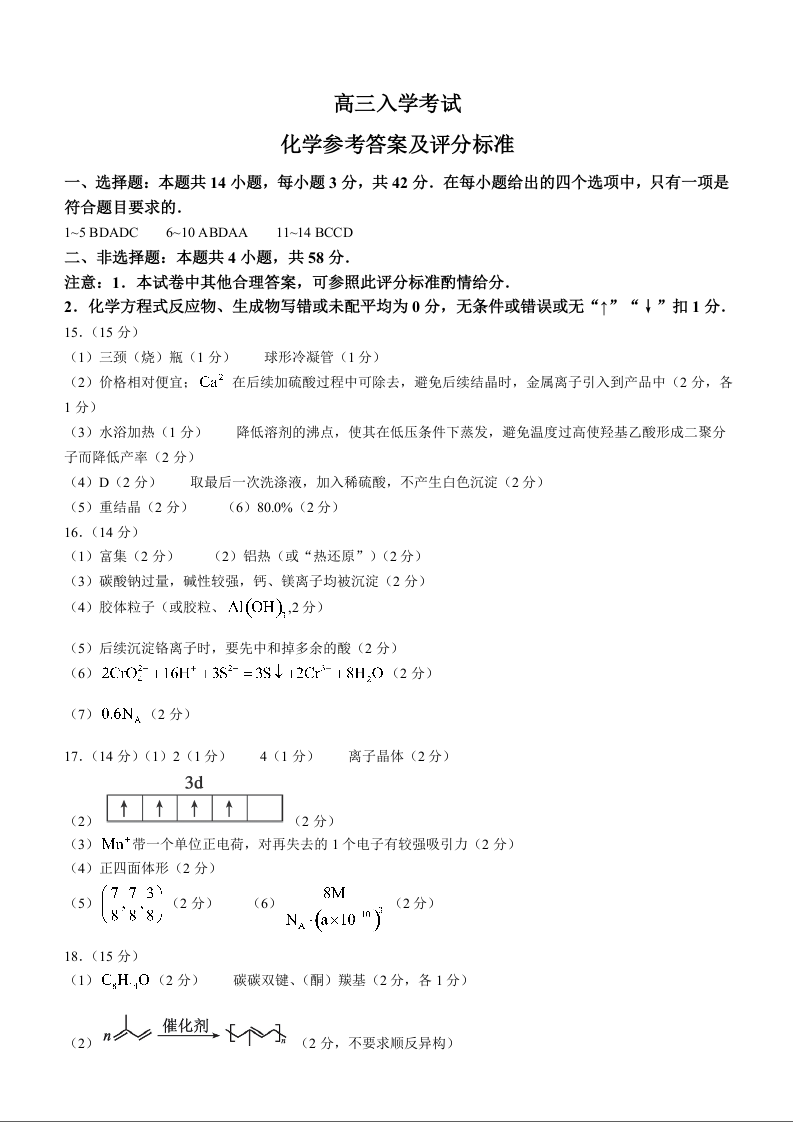 四川省成都市蓉城名校联考2024-2025学年高三上学期开学考试 化学答案