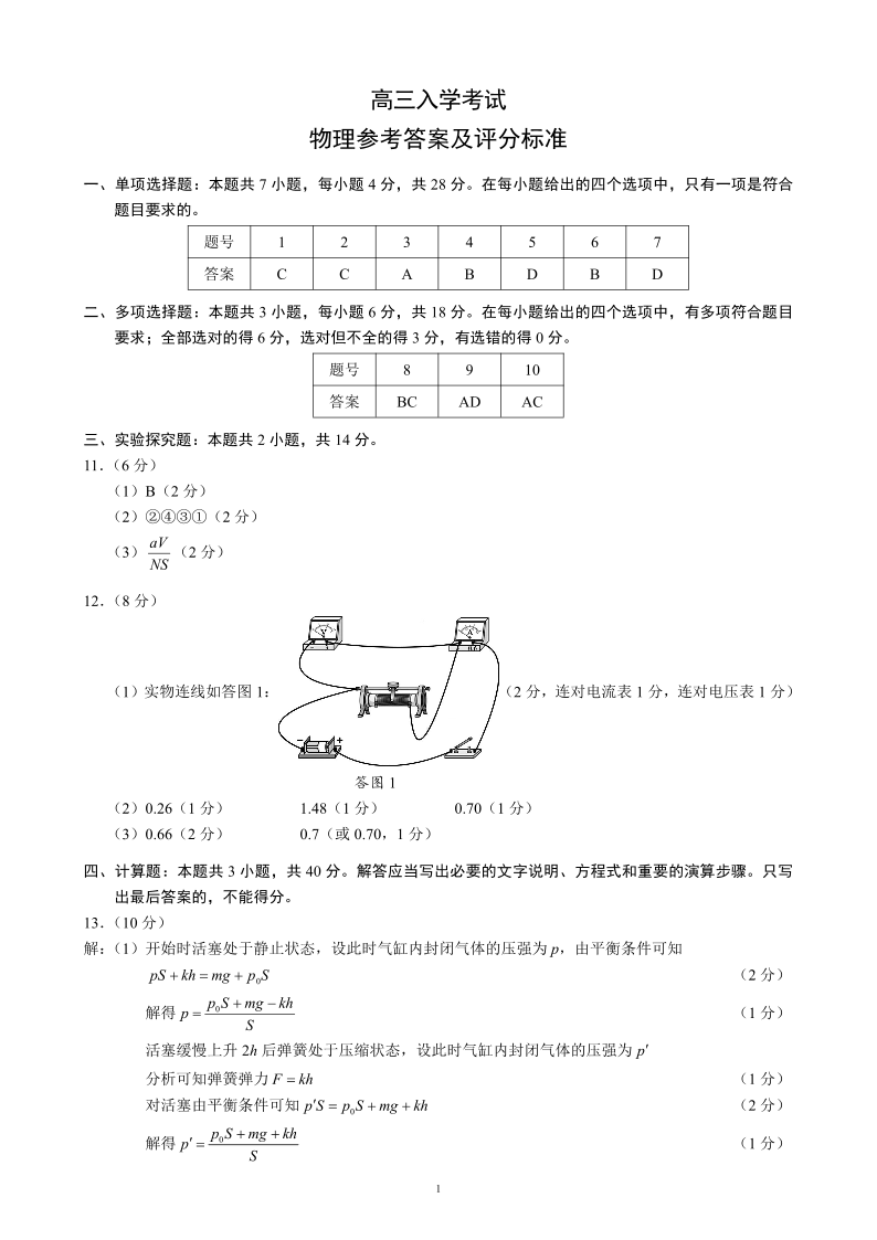 四川省成都市蓉城名校联考2024-2025学年高三上学期开学考试 物理答案