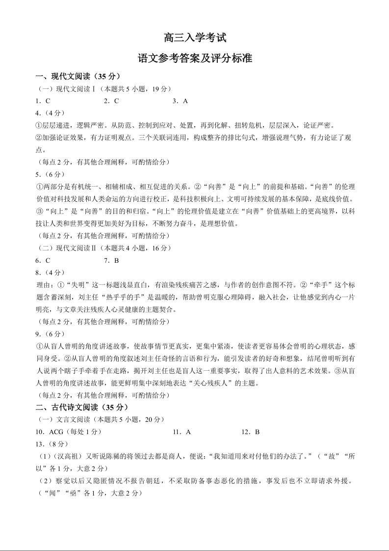 四川省成都市蓉城名校联考2024-2025学年高三上学期开学考试 语文答案