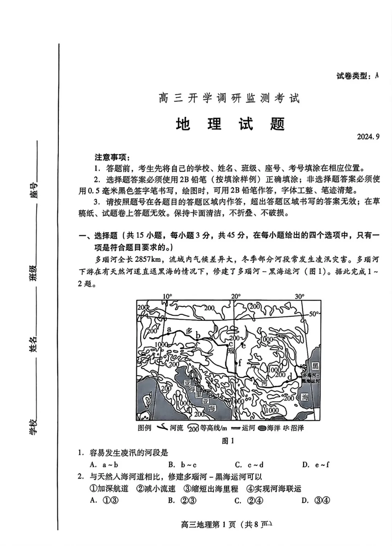 山东省潍坊市2025届高三开学调研监测考试 地理