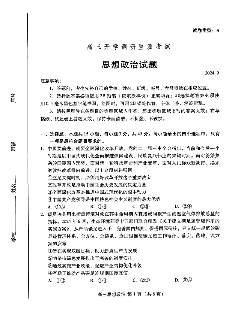 山东省潍坊市2025届高三开学调研监测考试 政治