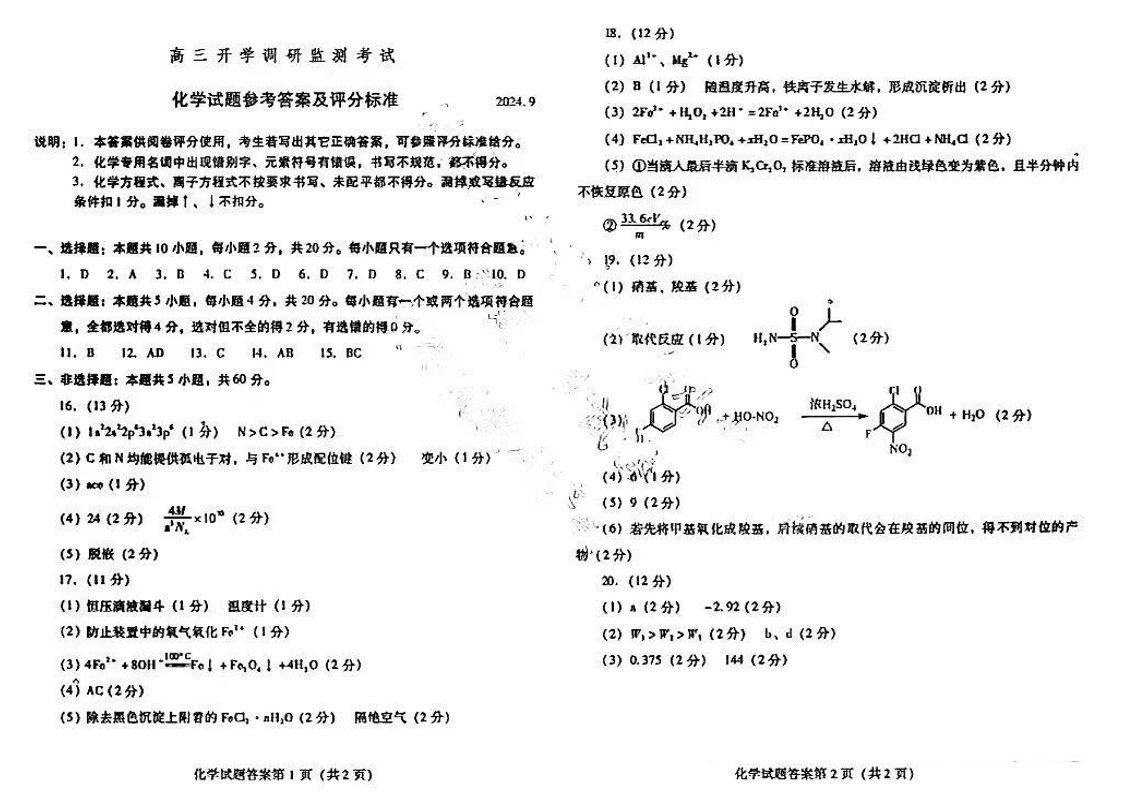 山东省潍坊市2025届高三开学调研监测考试 化学答案