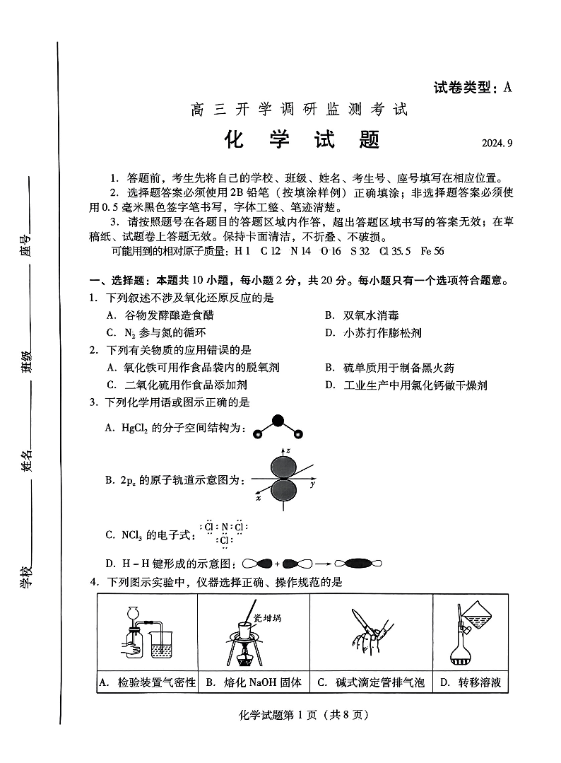 山东省潍坊市2025届高三开学调研监测考试 化学
