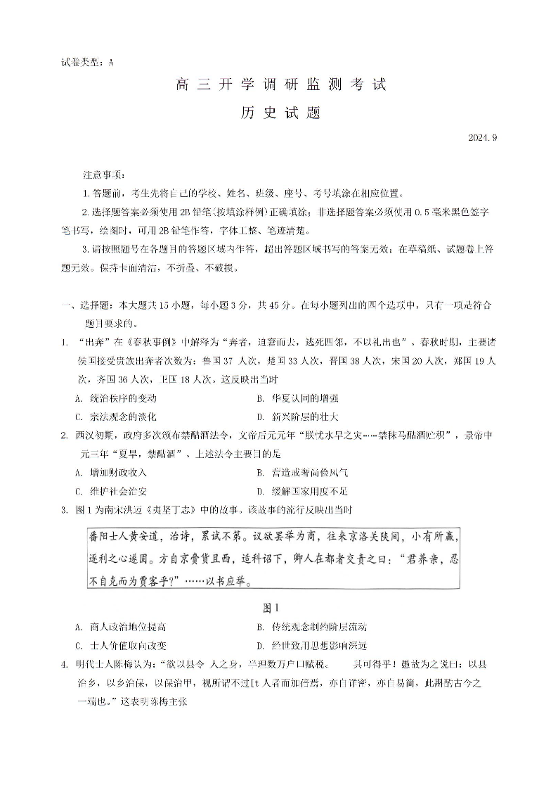 山东省潍坊市2025届高三开学调研监测考试 历史