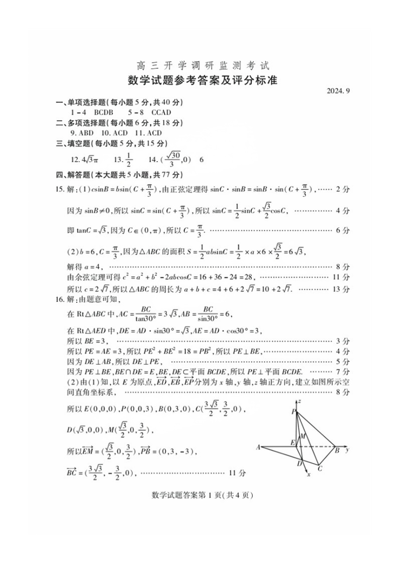 山东省潍坊市2025届高三开学调研监测考试 数学答案