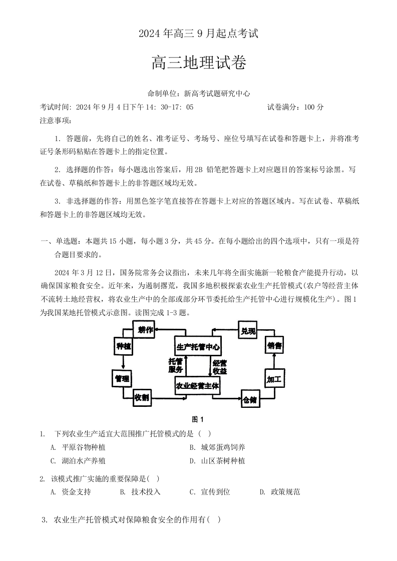 湖北省新高考联考协作体2025届高三上学期开学考试 地理