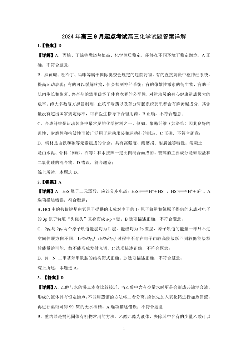 湖北省新高考联考协作体2025届高三上学期开学考试 化学答案