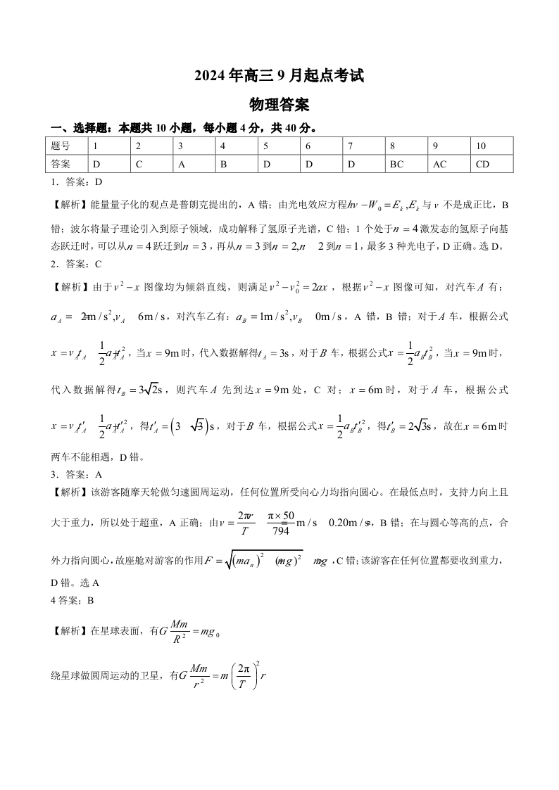 湖北省新高考联考协作体2025届高三上学期开学考试 物理答案
