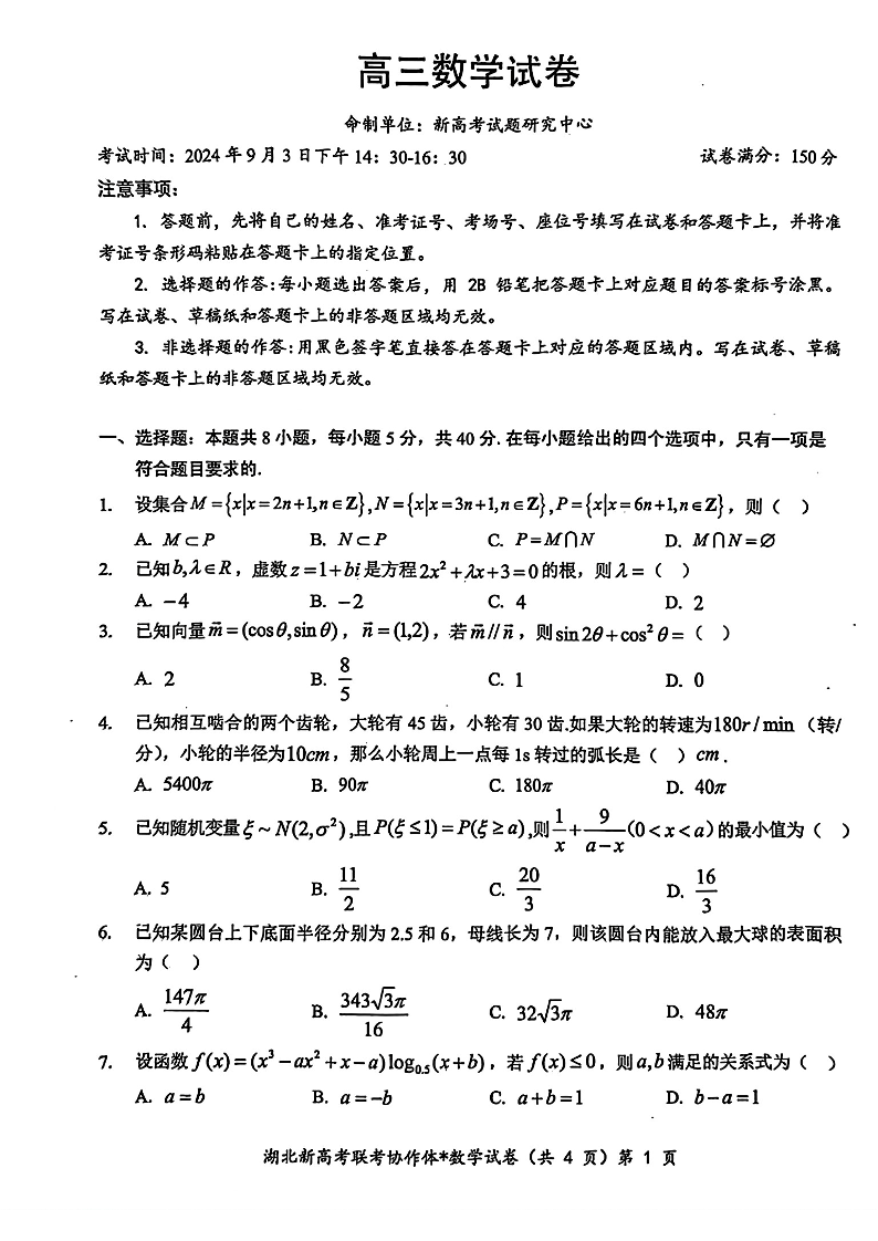 湖北省新高考联考协作体2025届高三上学期开学考试 数学