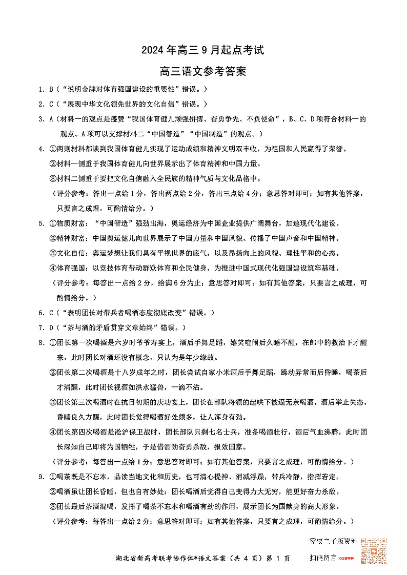 湖北省新高考联考协作体2025届高三上学期开学考试 语文答案