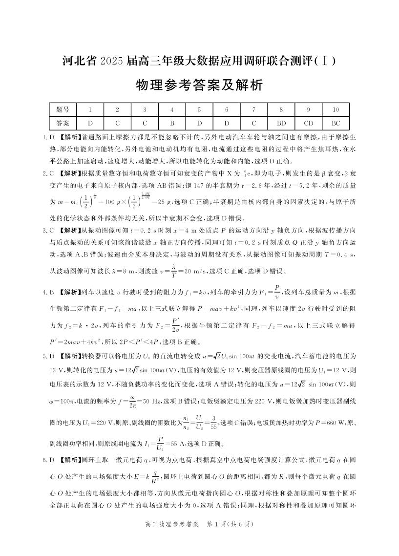 河北省2025届高三大数据9月应用调研联合测评(Ⅰ)物理答案