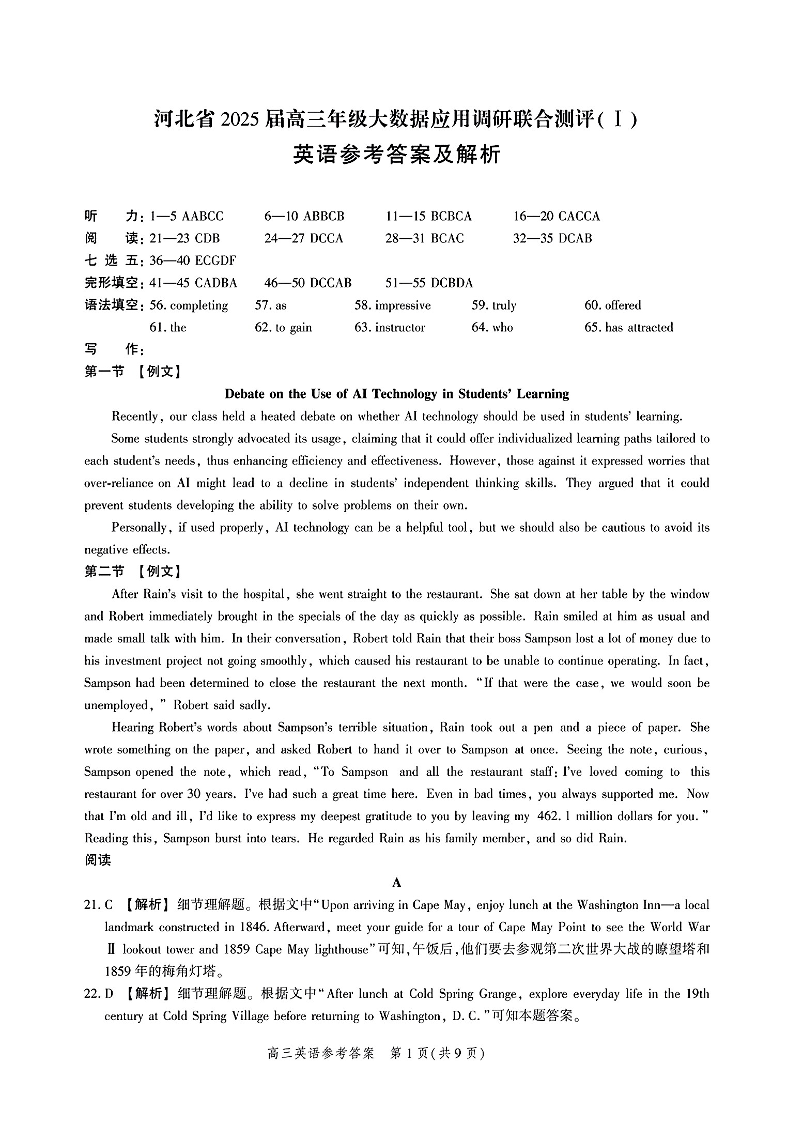 河北省2025届高三大数据9月应用调研联合测评(Ⅰ)英语答案