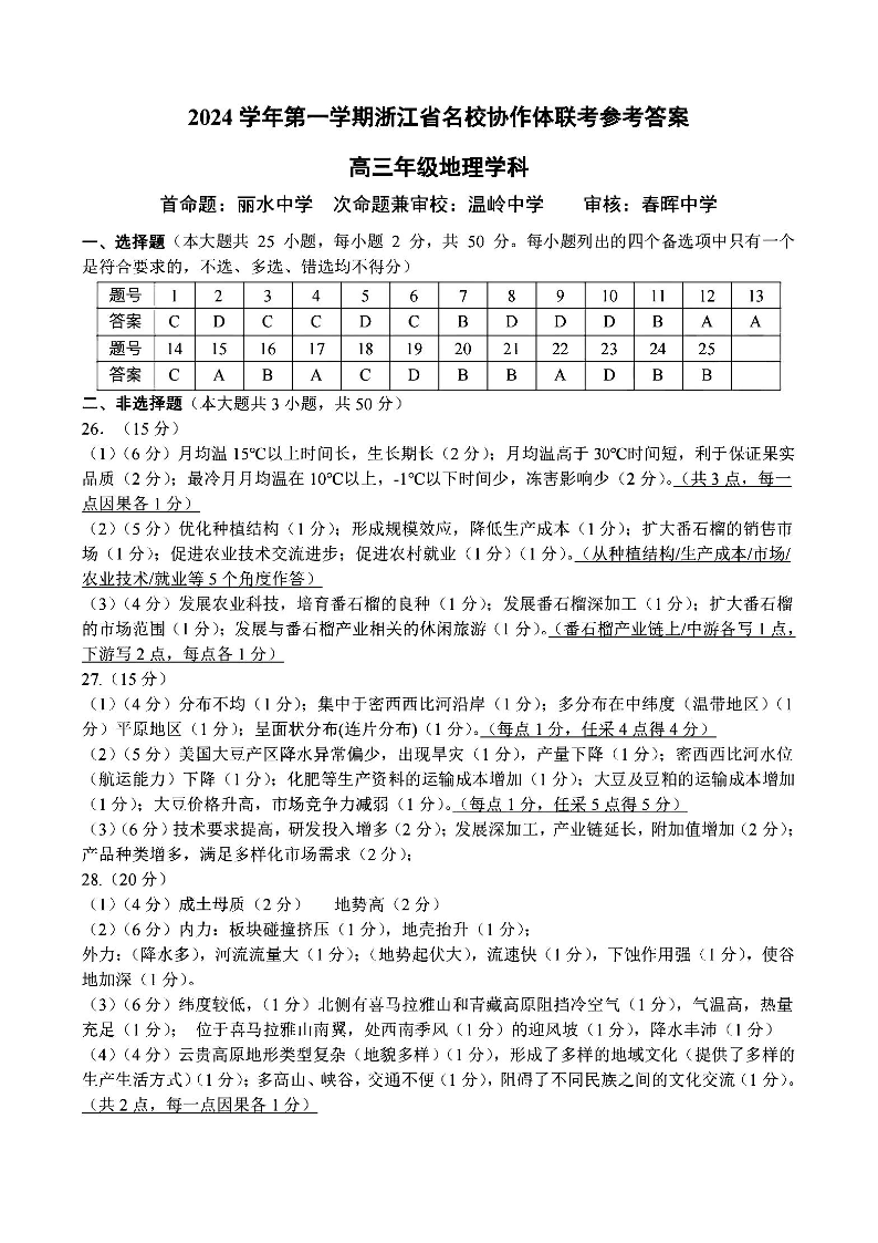 2025届浙江省G12名校协作体高三返校考 地理答案