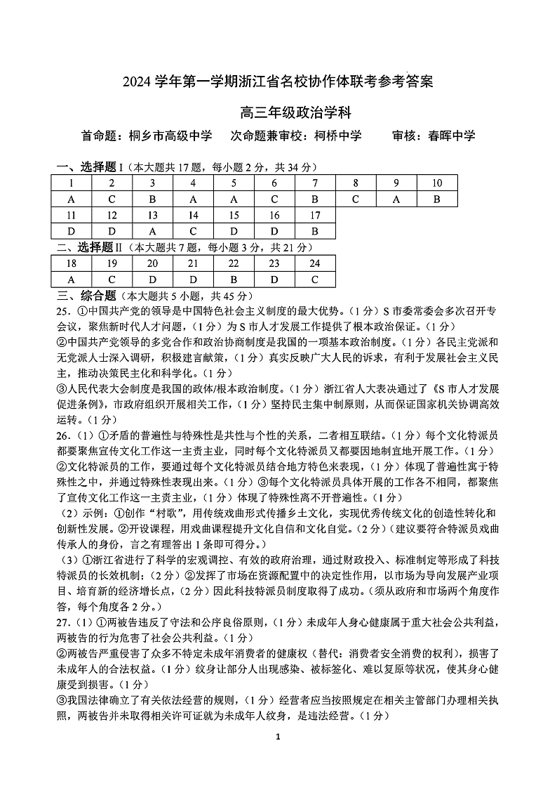 2025届浙江省G12名校协作体高三返校考 政治答案