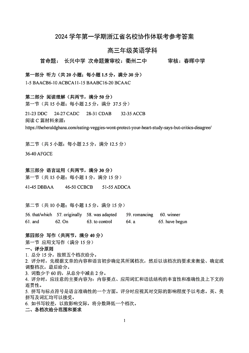 2025届浙江省G12名校协作体高三返校考 英语答案