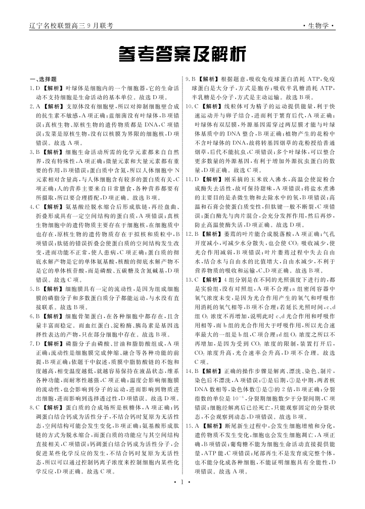 辽宁省名校联盟2024年高三9月份联合考试 生物答案