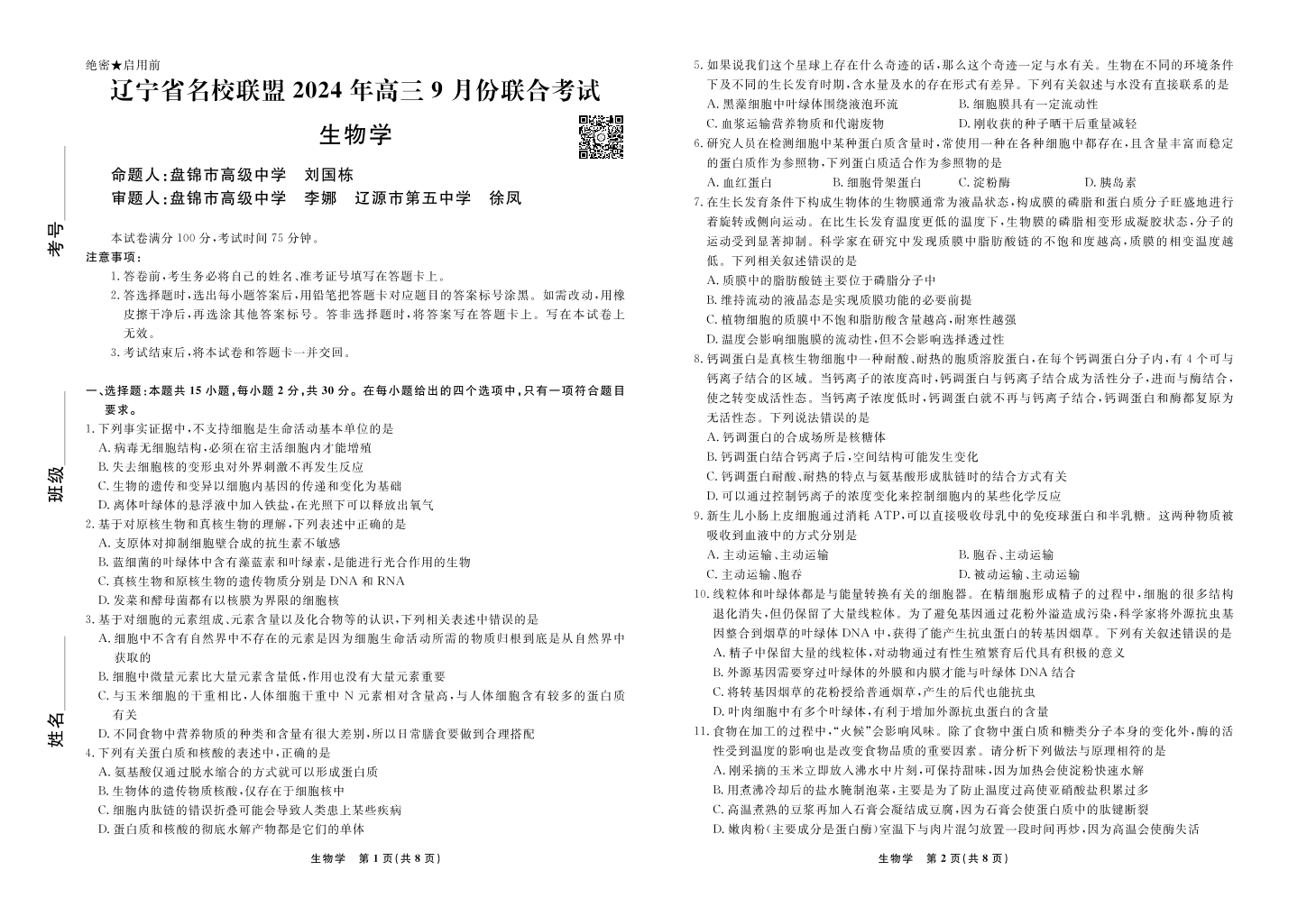 辽宁省名校联盟2024年高三9月份联合考试 生物