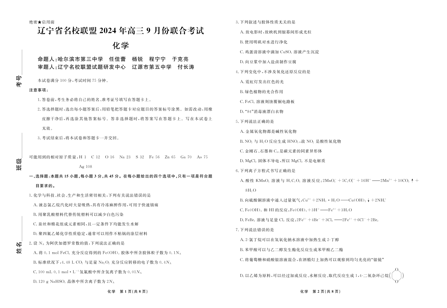 辽宁省名校联盟2024年高三9月份联合考试 化学