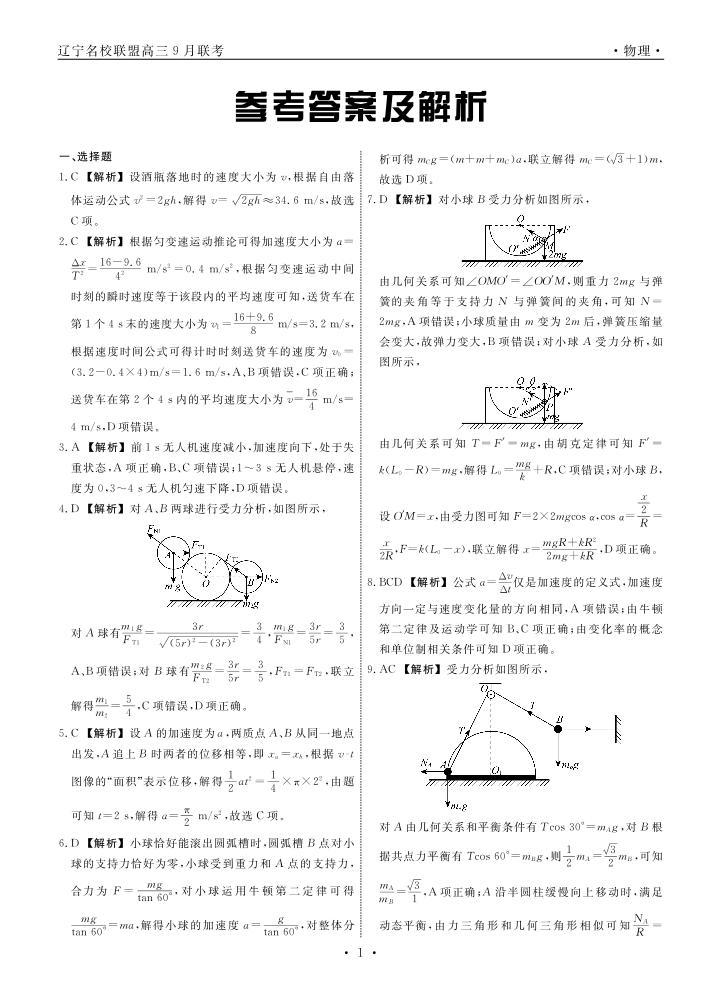 辽宁省名校联盟2024年高三9月份联合考试 物理答案
