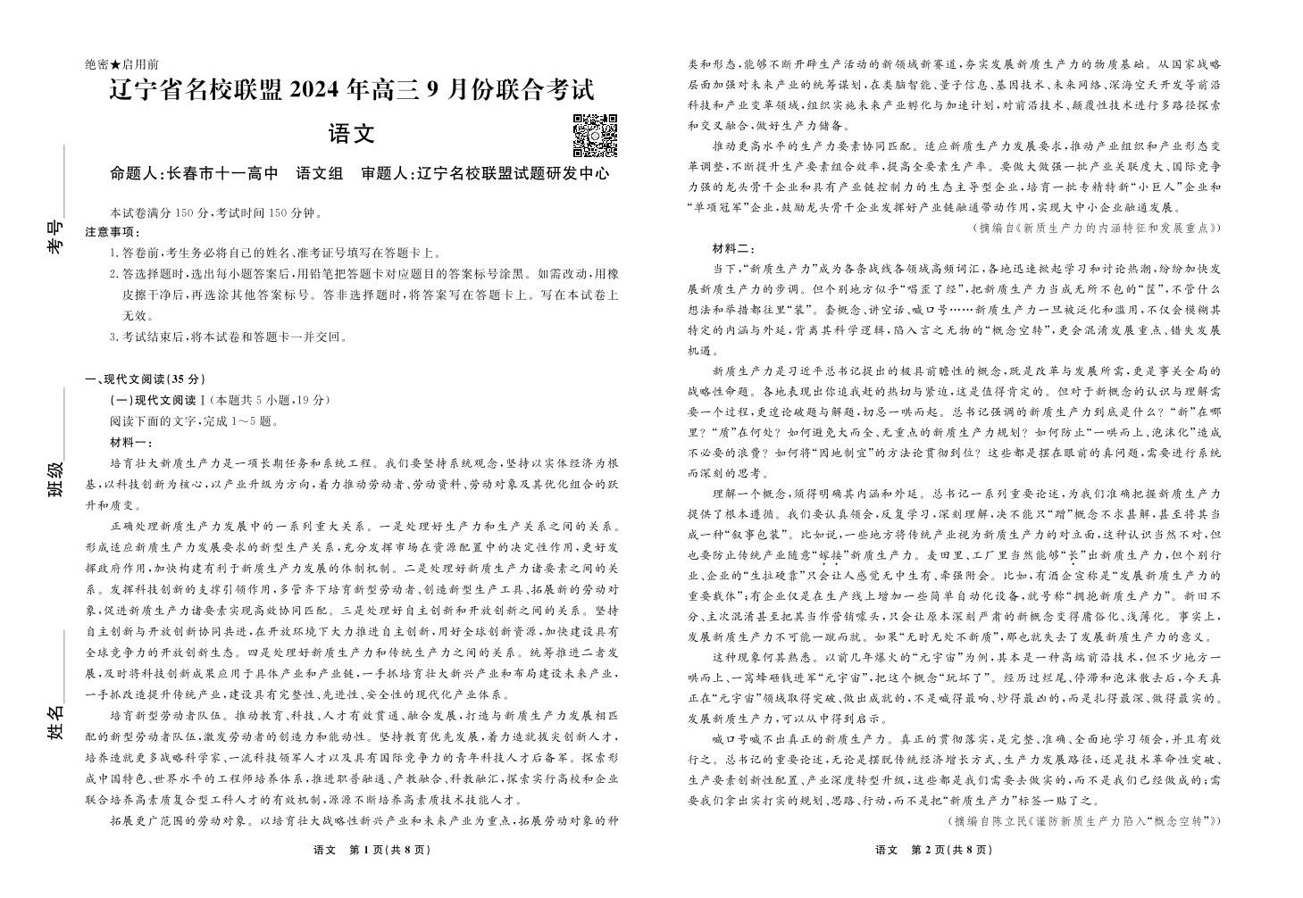 辽宁省名校联盟2024年高三9月份联合考试 语文