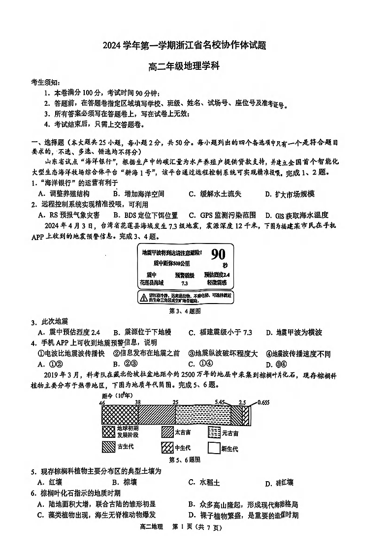 浙江省G12名校协作体2024学年高二第一学期返校联考 地理