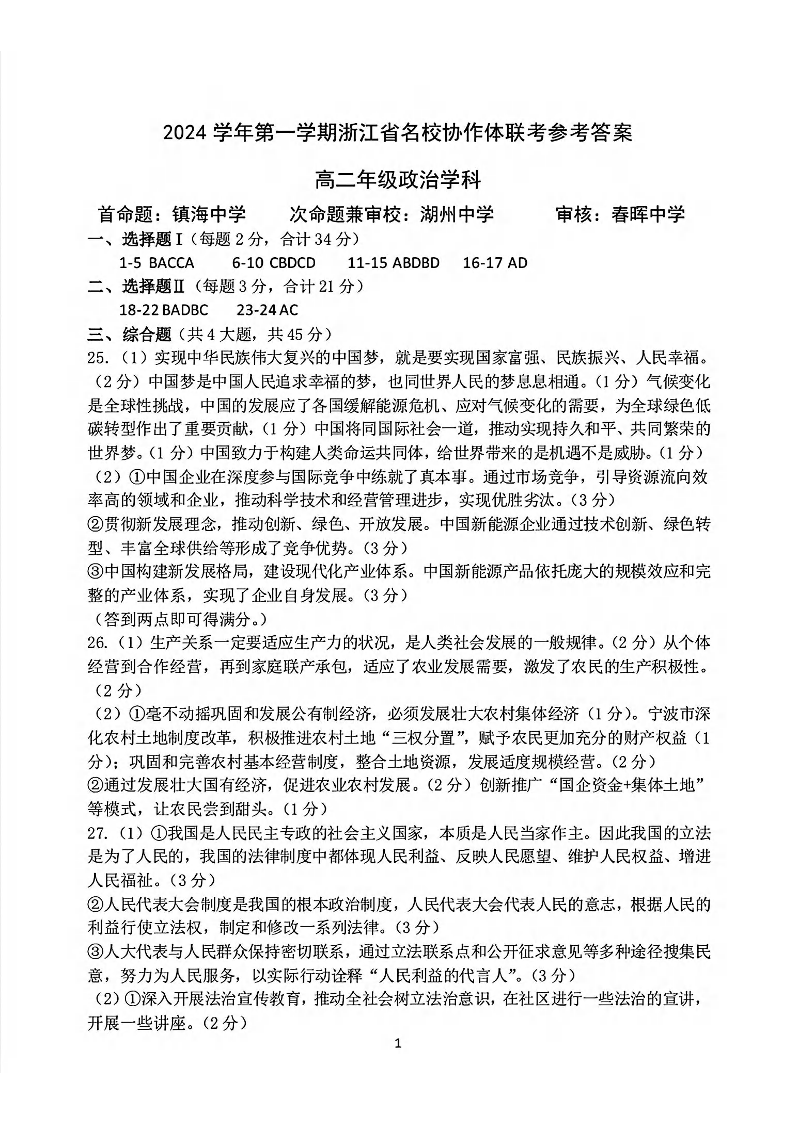 浙江省G12名校协作体2024学年高二第一学期返校联考 政治答案