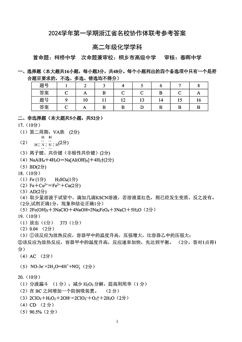 浙江省G12名校协作体2024学年高二第一学期返校联考 化学答案