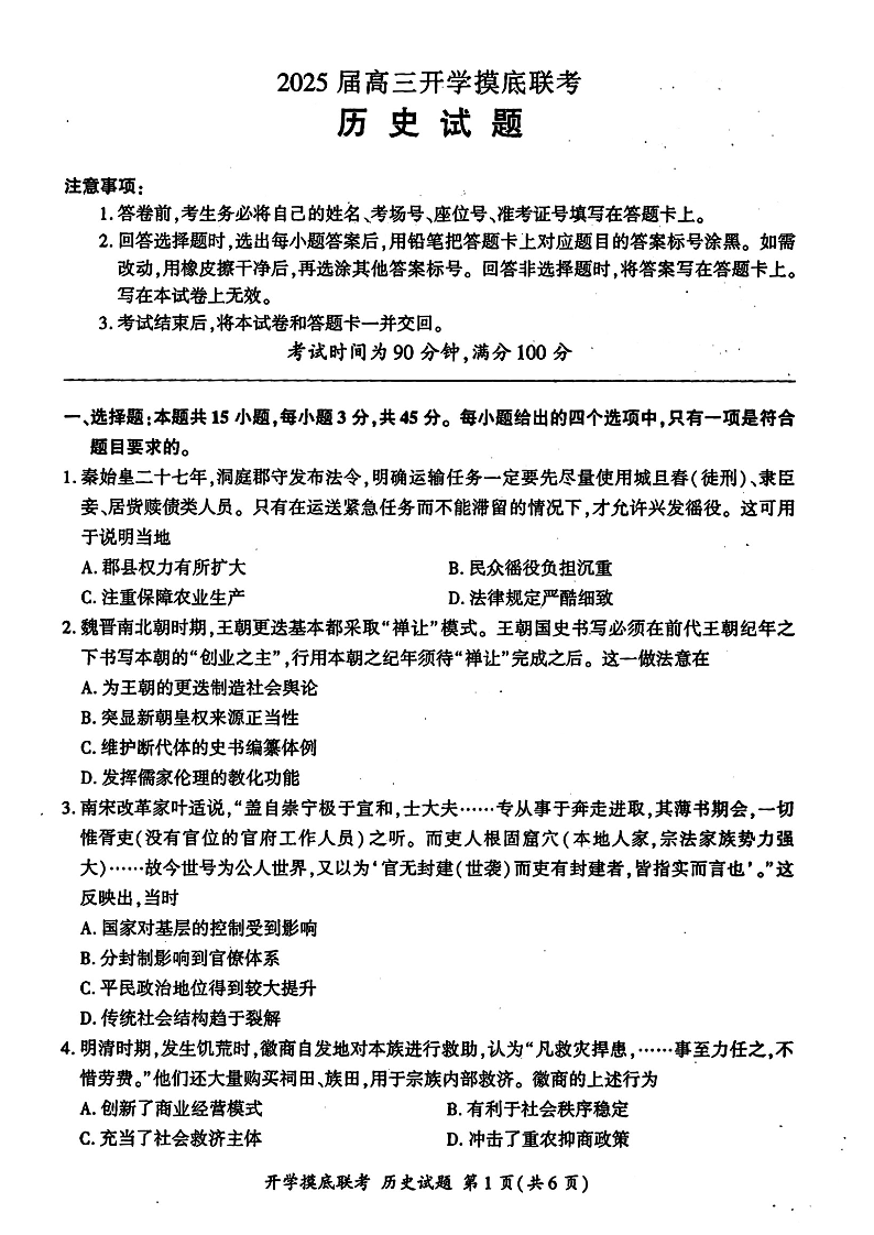 山东省百师联盟高三开学摸底联考 历史