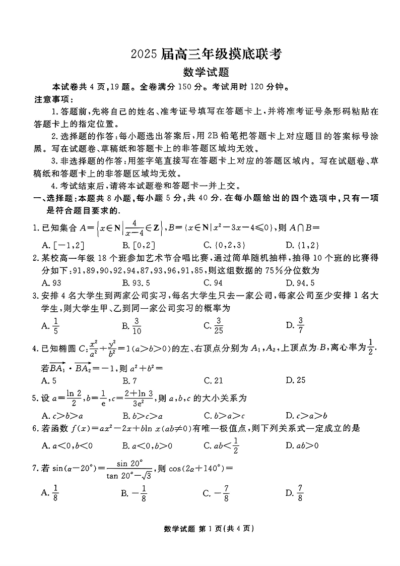 山东省衡水金卷2025届高三年级上学期九月摸底联考 数学
