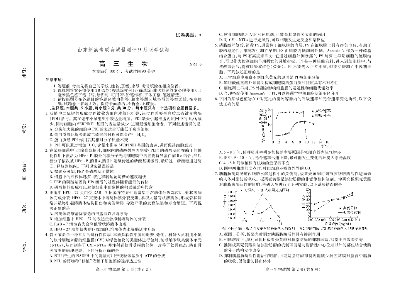山东新高考联合质量测评9月联考(开学考)生物
