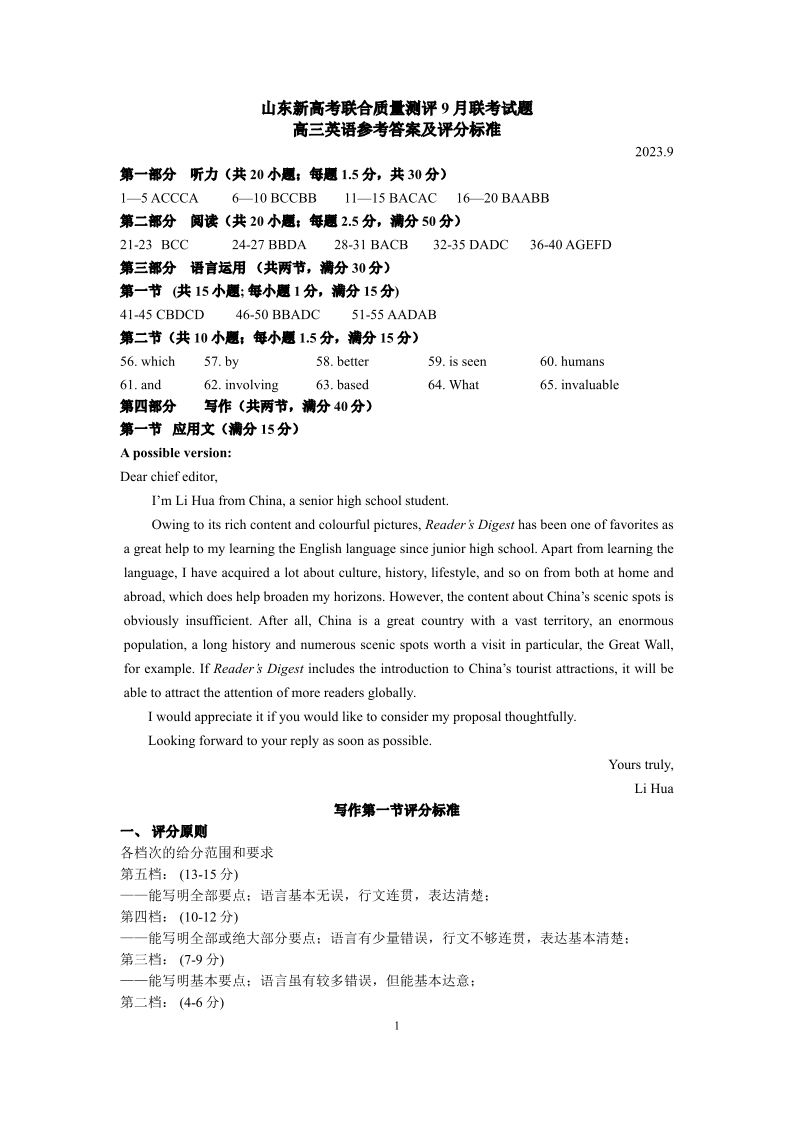 山东新高考联合质量测评9月联考(开学考)英语答案