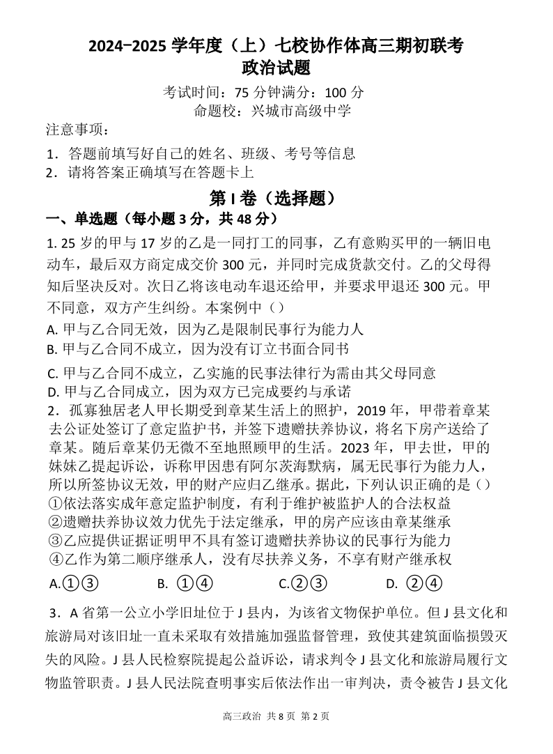 辽宁省2024-2025学年度(上)七校协作体高三期初联考 政治